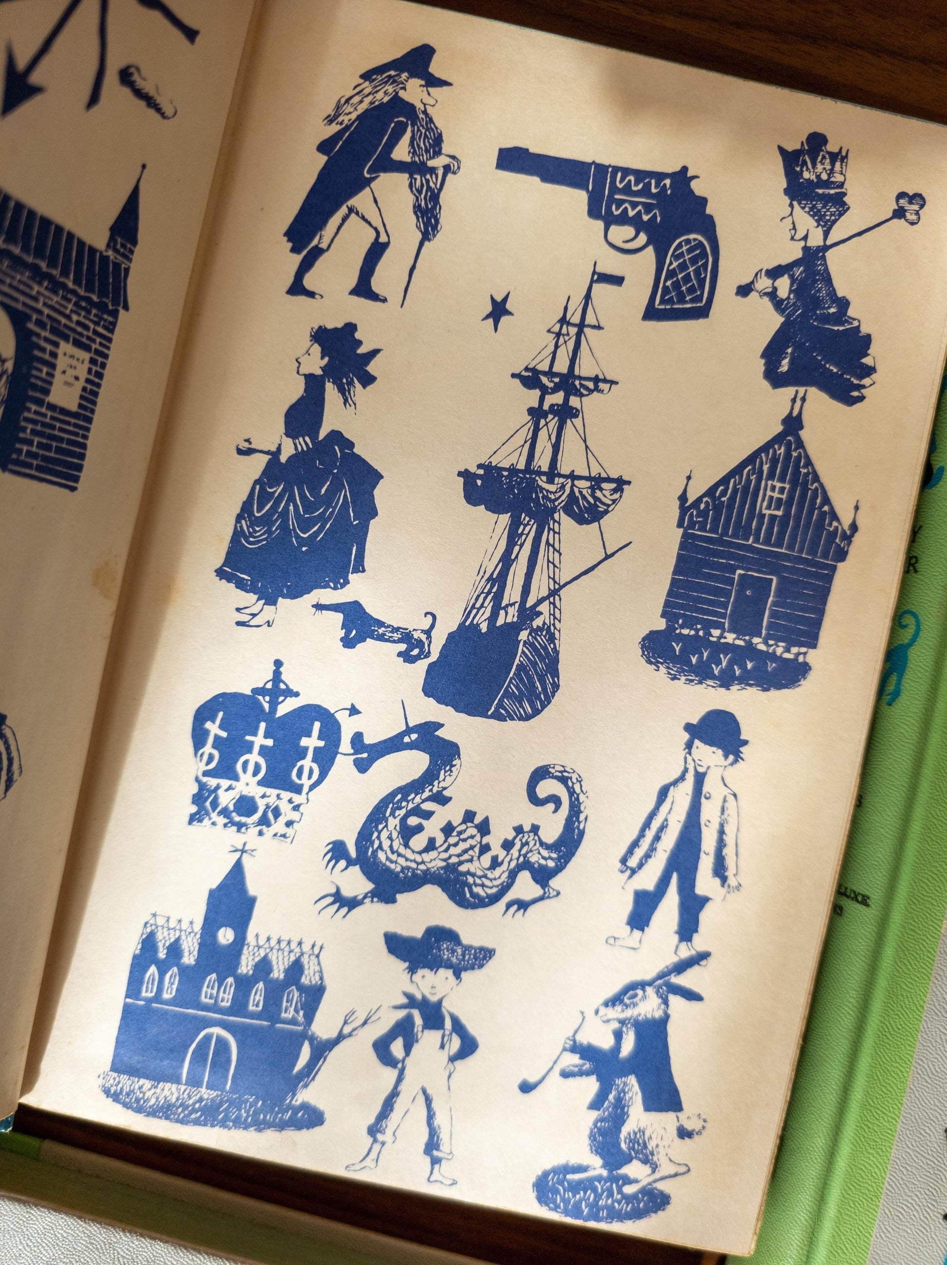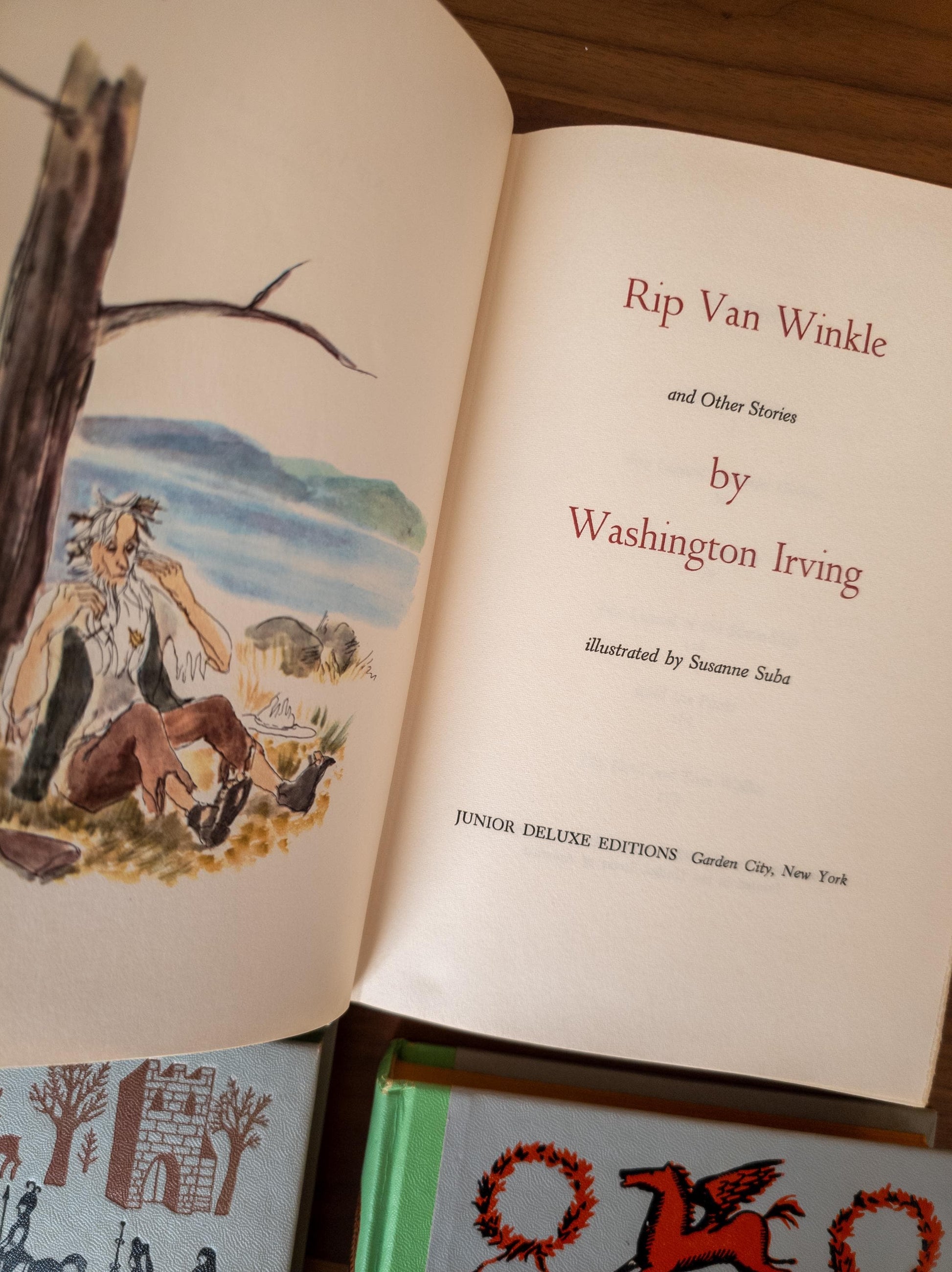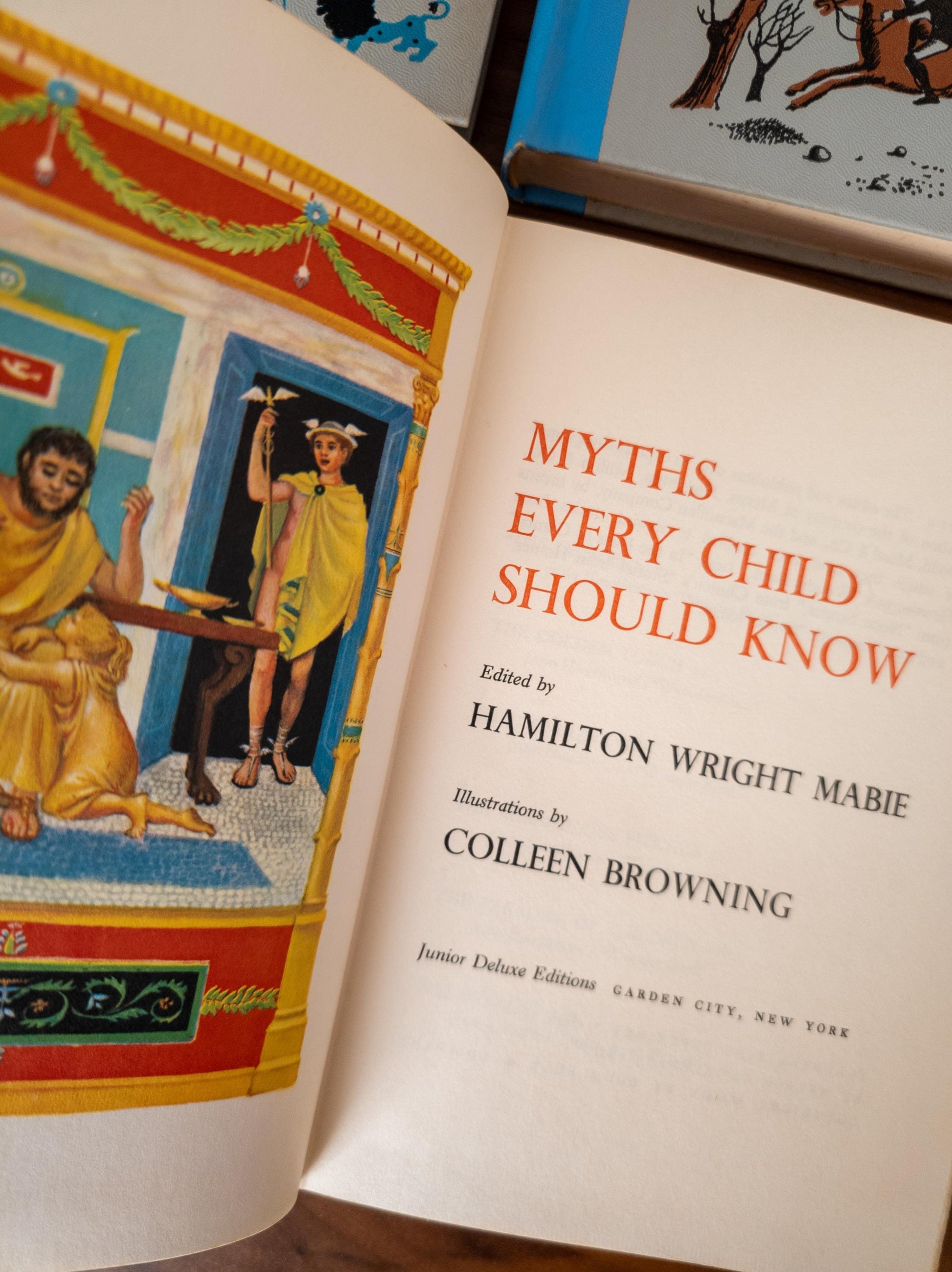 Six blue and green Junior Deluxe Edition books. These books are a fun colorful decor addition to a child's room or nursery, and they have well-known titles. These editions were published in the 1940s-1960s. The titles are: Davy Crockett, Rip Van Winkle, Stories from the Arabian Nights, The Black Arrow, Toby Tyler, and Myths Every Child Should Know.